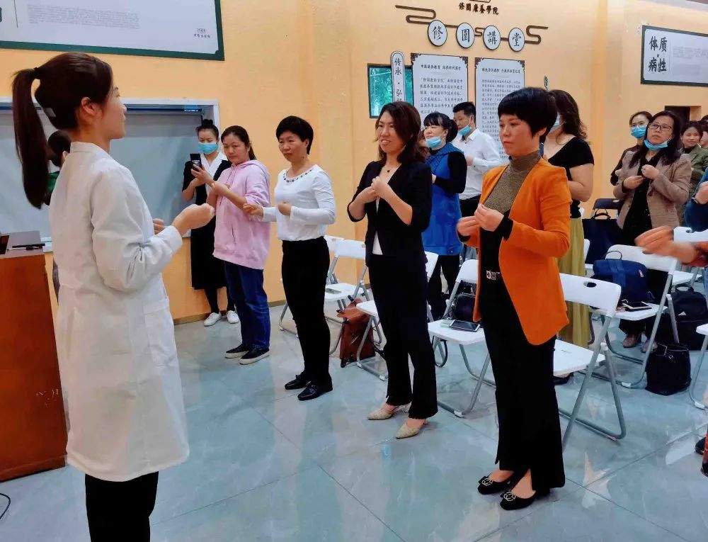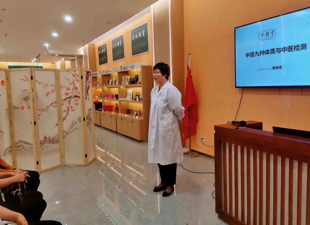 分享间隙由专业的医师团队带领大家通过中医引导疗法-传授修园拍打操来疏通经络,缓解疲劳。会间学员情绪高涨,积极配合,真正做到了惠及个人,健康到家的目标。而后修园康养学院黄燕青院长为大家讲解《9种体质和中医检测》的内容,让大家了解9种体质的构成与特点,以及各类体质的疗养方法等。