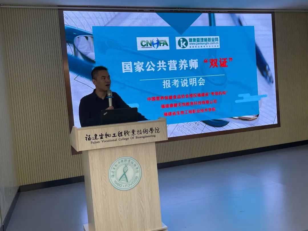 5月9日下午13:00,康健无忧教育的池老师受福建省生物工程职业技术学院邀请,在学院七楼多功能培训教室对健康食品系近200位需要参加”2021国家公共营养师职业技能等级“报考的同学进行了一场“双证”考试说明,池老师为现场同学们详细解读1、什么是国家职业技能等级考试?2、双证考证有何价值?3、如何报考,如何有效学习备考?