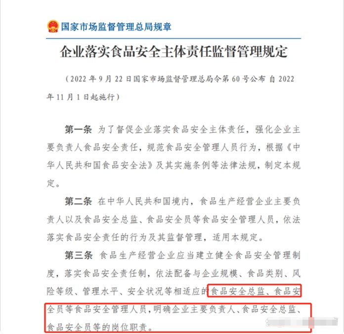 2022年9月26日,市场监管总局发布《企业落实食品安全主体责任监督管理规定》。规定要求:具有一定规模的食品生产经营企业在配备食品安全管理师的同时,应当依法配备食品安全总监;要建立企业主要负责人负总责,食品安全总监、食品安全管理师分级负责的食品安全责任体系。食品生产经营企业未按规定配备、培训、考核食品安全管理人员,由县级以上地方市场监督管理部门责令改正,给予警告;拒不改正的,处5000元以上5万元以下罚款;情节严重的,责令停产停业,直至吊销许可证。