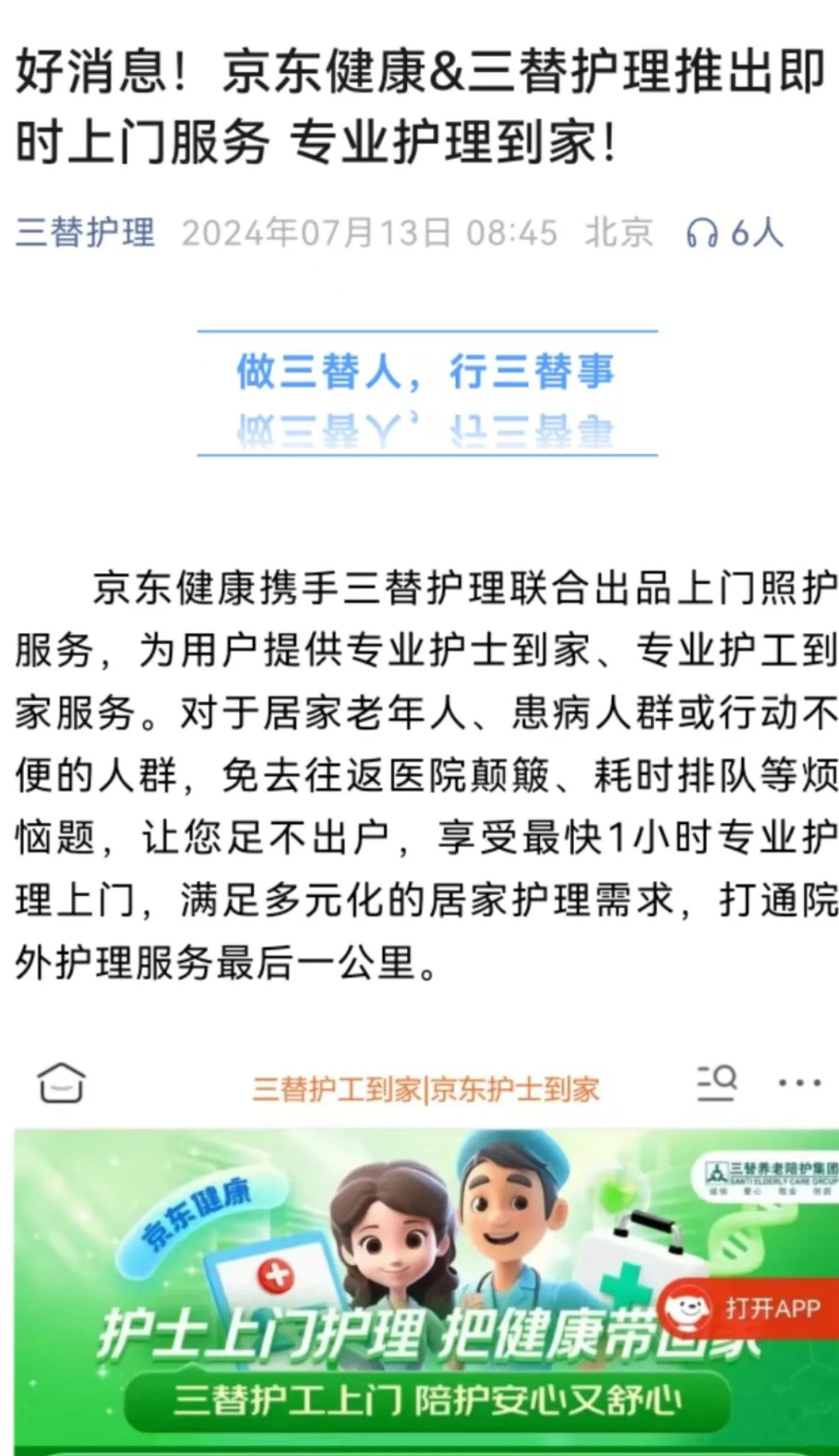 三替护理集团始创于 1992 年,是以病患护理、居家护理、医辅服务、家政服务、养老院管理、物业管理为主业的集团连锁化企业。三替围绕居家护理服务专门搭建了星级护理员培训服务体系和三级质量控制体系:护工人员全部经过身份核查、健康体检、礼仪培训、专业技能培训与考核,实现服务内容标准化、规范化、职业化。与客户签约之后,还有严谨的服务质量监督管理体系,为雇主解除后顾之忧。为长期卧床、不能自理、行动不便的老年人以及新生儿等,有居家护理需求的特殊人群提供优质的居家护理服务。