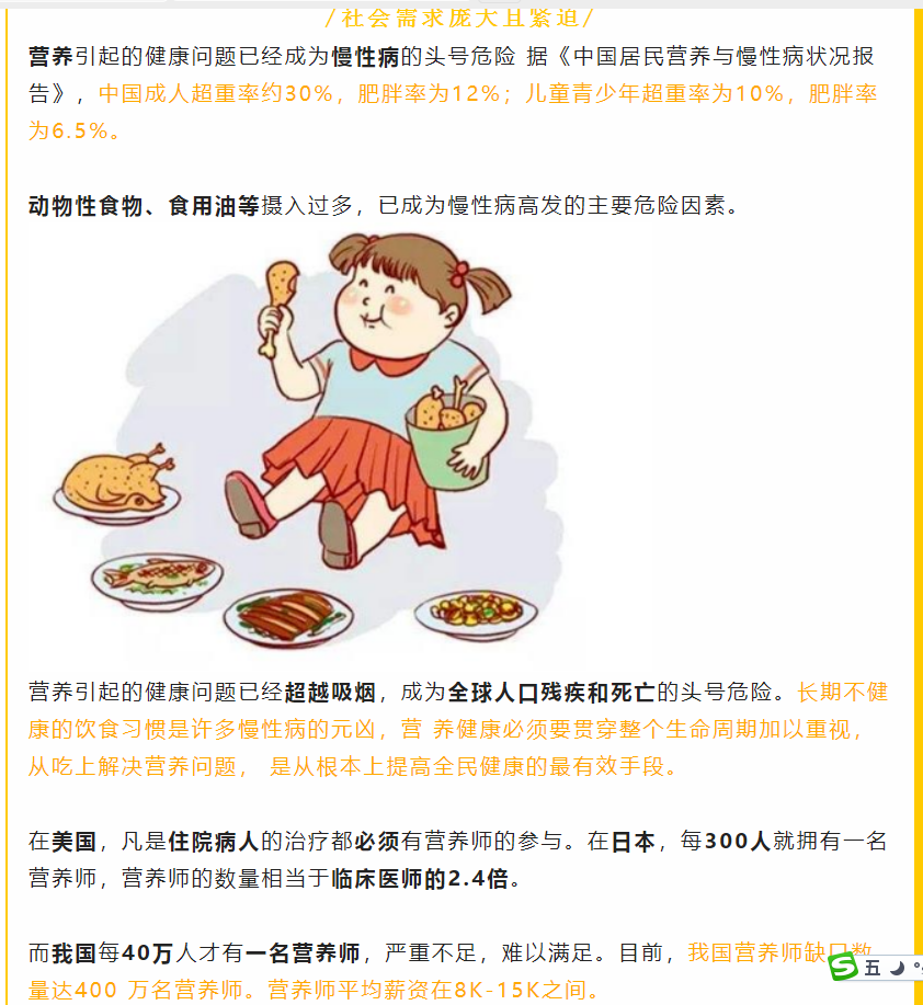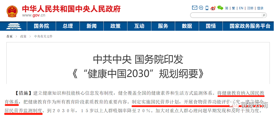 《“健康中国2030“规划纲要》中明确表示:要将健康教育纳入国民教育体系,制定实施国民营养计划,开展食物营养功能评价研究,建立健全居民营养检测制度。《健康中国行动》(2019—2030年),提出到2022年要求每万人中有一名公共营养师(营养指导员)。